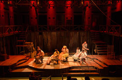 "I can be hyper critical with lighting, it’s just in my nature, but the lighting for this play was incredible. Dan Schoedel's use of templates made enough texture to show depth on the stage but never really over took or became overbearing to the point of distraction. His plot had LED lights shining straight down the walls, not only adding to the texture but it also making the space look twice as large. The contrast in color through the whole play was impressive and eye pleasing. Continuity was at the fore front. If a scene was in the chapel, you knew it; outdoors, you knew it. In the very first scene, Schoedel colors the open area upstage with aqua LED’s and spinning templates, making it look exactly like a river. His use of isolation extenuated the blocking that Banks did throughout. This was one of the best lighting jobs I’ve seen in years."